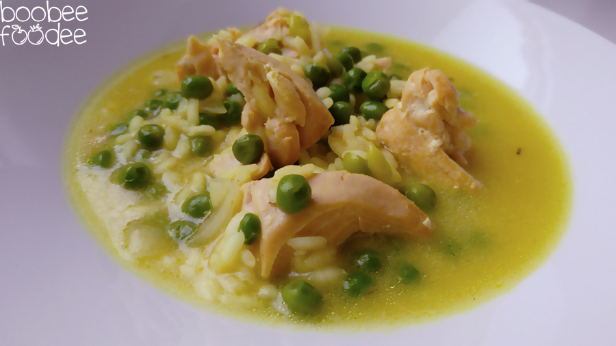 Olje segrejemo in na njem zarumenimo nasekljano čebulo, malce zatem, ko čebula porumeni, pa dodamo še nasekljan česen. Ko le-ta zadiši, v jed damo začimbe in riž. Nekajkrat premešamo, da riž spremeni barvo in postekleni, dodamo grah in razkosane fileje lososa ter zalijemo s toliko vode, da je jed prekrita. Kuhamo še 15 minut, občasno premešamo, nato pa ugasnemo.
